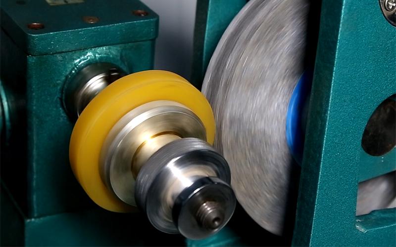 Случайно берется колесо из готовой продукции, и на 35-тонном прессе проводится разрушительное принудительное отслаивание, чтобы проверить, соответствует ли соединение между полиуретаном и металлическим центром колеса нашим стандартам.